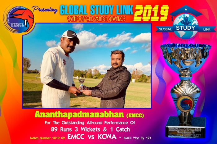 EMCC beat KCWA by 121 runs. Ananthapadmanabhan from EMCC won the man of the match award for the outstanding allround performance of 89 runs, 3 wickets and 1 catch.