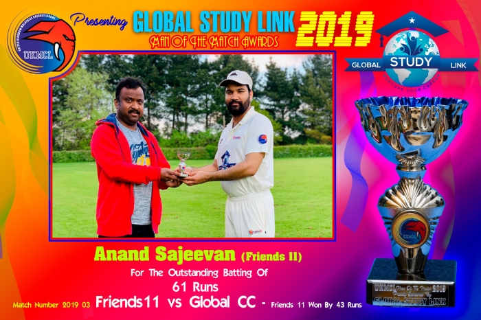 News 11 May Match update : Friends 11 vs Global CC Friends 11 beat Global CC by 43 runs; Anand Sajeevan from Friends 11 was man of the match for the outstanding batting of 61 runs.